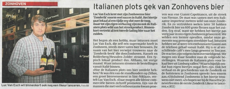 Vorig jaar lanceerde Luc Van Esch het Limburgs/Zonhovense bier 'Zonderik'. Het biertje vloeit echter ondertussen nationaal van Lommel tot in Oostende al een tijdje erg vlot over de toog. Maar tot zijn eigen verbazing zijn nu ook de Italianen plots wild van het Limburgse streekproduct. Binnenkort vertrekt al een tweede lading richting Italië. Het begon als een uitdaging. Maar intussen moet Luc Van Esch, die zelf ook een supermarkt heeft in Zonhoven, steeds meer vaten bier brouwen. In ons eerste jaar brouwde zelfs al meer dan 50.000 liter Heerlijk Plezierbier. De naam van het bier verwijst trouwens naar de 'Zonderik beek' die door Zonhoven, Hasselt en Bolderberg/Heusden-Zolder stroomt. De Zonderikbeekvallei situeert zich in het Vijvergebied Midden-Limburg', thans 'De Wijers'. Een typisch lokaal product dus. Althans, tot vorige maand. Want intussen stromen de bestellingen vanuit Italië binnen. "Hoe de Italianen plots ons bier ontdekt hebben? Ik was, met onze Zonderik, één van de standhouders op Zythos, een groot bierevenement met 260 deelnemers in Sint-Niklaas," vertelt Luc Van Esch. "Daar mogen alle minder commerciële bieren zichzelf promoten. Zonderik scoorde meteen met twee bieren, in de top 10 . Eén van de mannen die met veel enthousiasme kwam proeven was ene Gianni Capobianco, uit de streek van Firenze. De man was samen met een Italiaanse importeur meteen wild van onze Zonderik. En zo vertrokken weken later 50 bakken Zonderik bier en 600 grote flessen naar het zuiden. Erg straf, want we hebben het biertje pas vorig jaar in ons eigen Zonhoven gelanceerd. We wilden een leemte opvullen, omdat onze gemeente nog geen eigen streekbier had. Intussen hebben we al weer een enthousiaste Gianni aan de telefoon gehad vanuit Italië. Hij is er al verschillende cafés mee langs geweest in Toscane. De reacties zijn volgens hem overweldigend. We mogen ons klaar houden voor de volgende bestellingen. waarom de Italianen plots voor lokaal bier uit Limburg vallen? Waarschijnlijk omdat hun eigen biertjes nogal flets zijn. Ze houden wel van de wat straffere Belgische producten. Ook het verhaal en de geschiedenis van de Zonderik en de holstenen in Zonhoven spreekt hen enorm aan. Wie weet mogen we hier dus binnenkort bussen vol Italiaanse toeristen verwachten?" Uitsluitend Zonhovens is het biertje trouwens niet meer. "We hebben de smaak intussen ook al uitgeprobeerd op jenever. Zo hopen we bij de Hasseltse jeneverfeesten de eerste 'Zonderik Likeur & Cream met Hasseltse Jenever' te lanceren. Verwacht ook een heerlijk assortiment Zonderik pralines met onze likeur. De naam kunnen we behouden, want de Zonderikbeek stroomt tenslotte ook naar Hasselt. Bron: HLN 17/09/2010 Tekst/Foto : Toon Royackers |